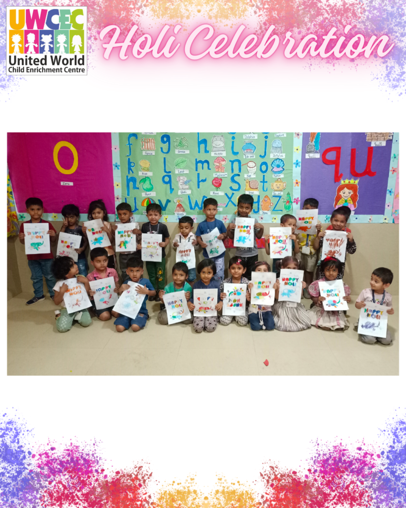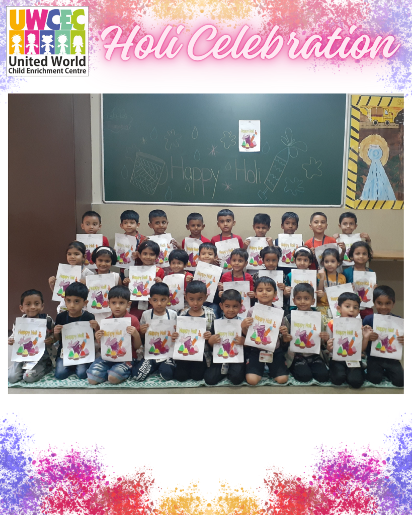 Children did activities based on the Holi celebration. Children were asked to wear colorful dresses for playing colors. Songs were played and children played with natural colours. They enjoyed playing colours with friends, teachers and aunties.