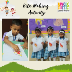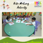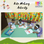 So at UWCEC we taught children how to tear and paste two different colors of crepe paper on their worksheets to form a colorful kite. This helped to enhance their hand-eye co-ordination and also to promote creativity.