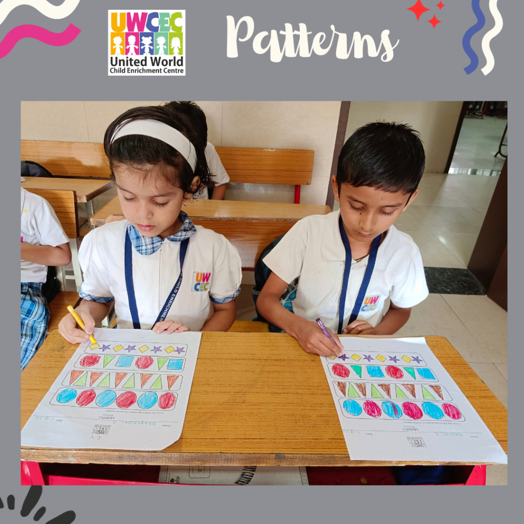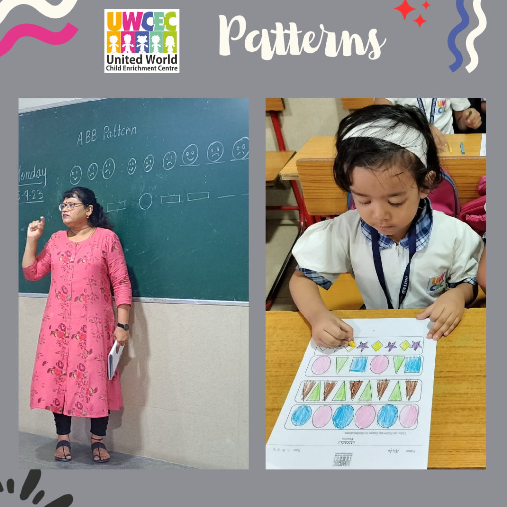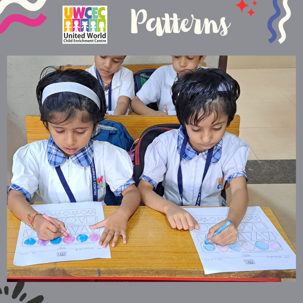 In UWCEC, the Sr.Kg. children are learning how to use patterns – like AB, AAB, ABB, ABC – in a very simple and interesting manner. They were provided with worksheets for practice and patterns of colours, shapes and sizes were also taught.