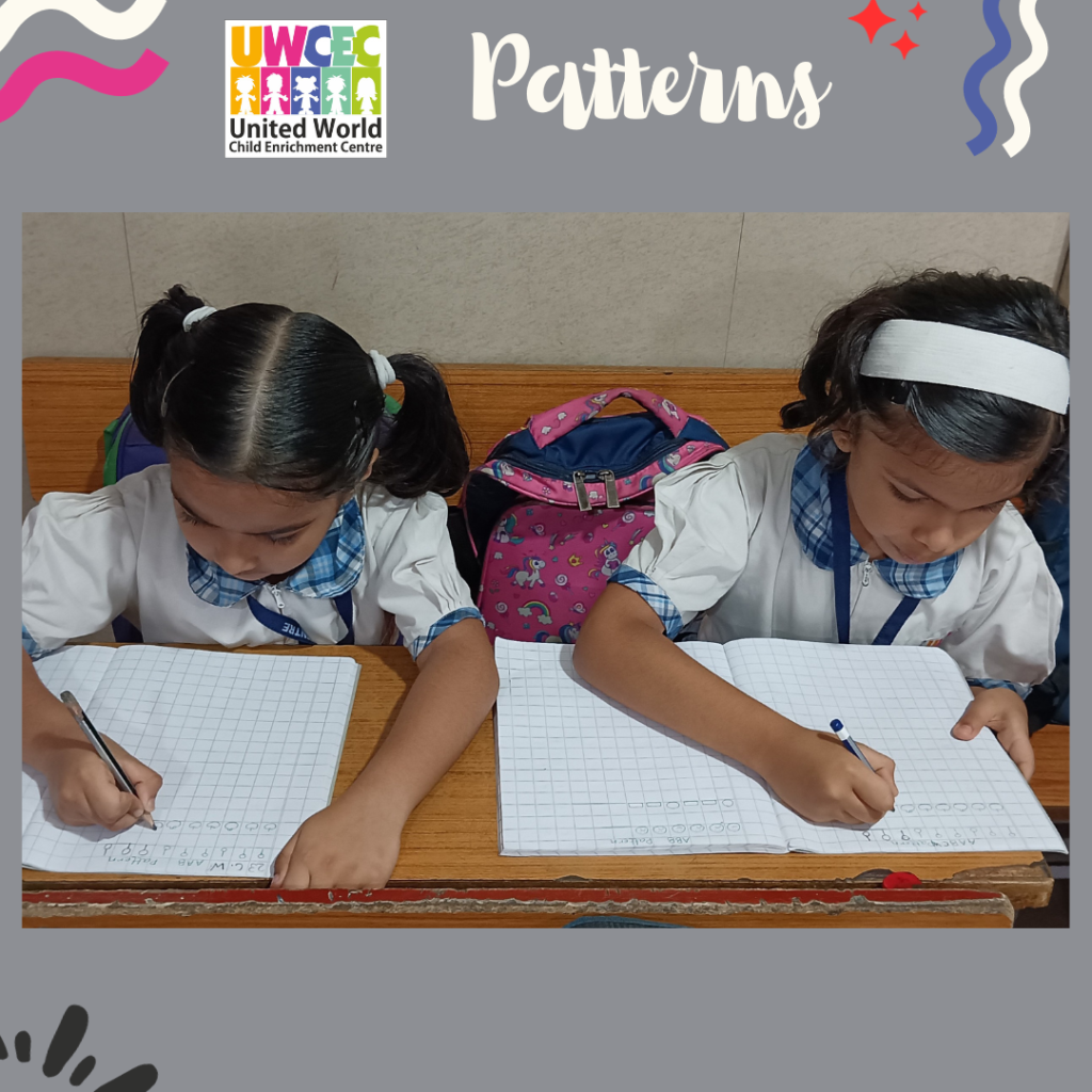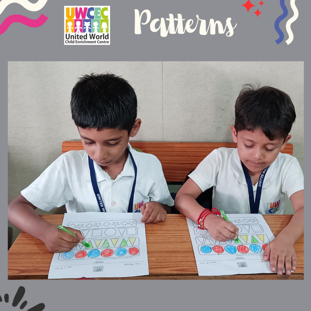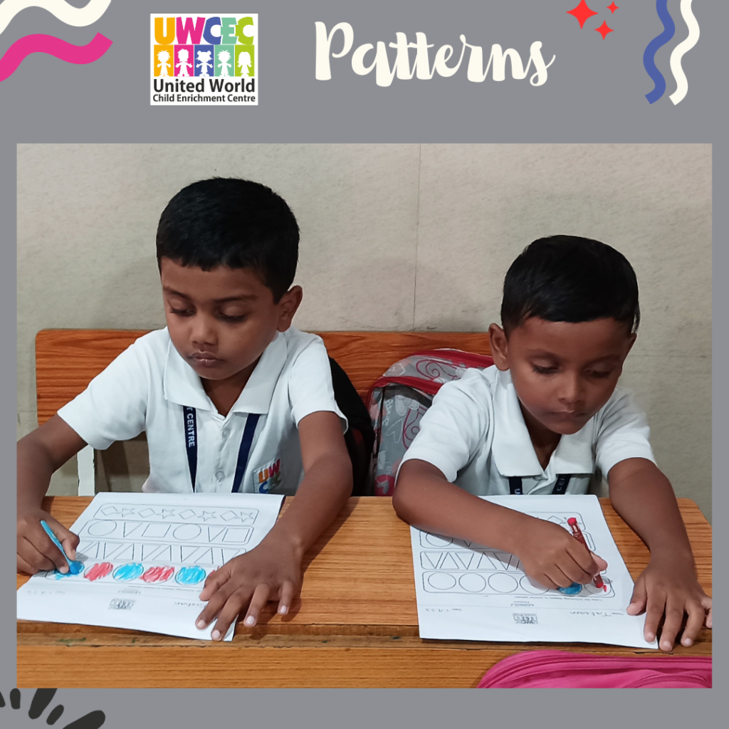 In UWCEC, the Sr.Kg. children are learning how to use patterns – like AB, AAB, ABB, ABC – in a very simple and interesting manner. They were provided with worksheets for practice and patterns of colours, shapes and sizes were also taught.