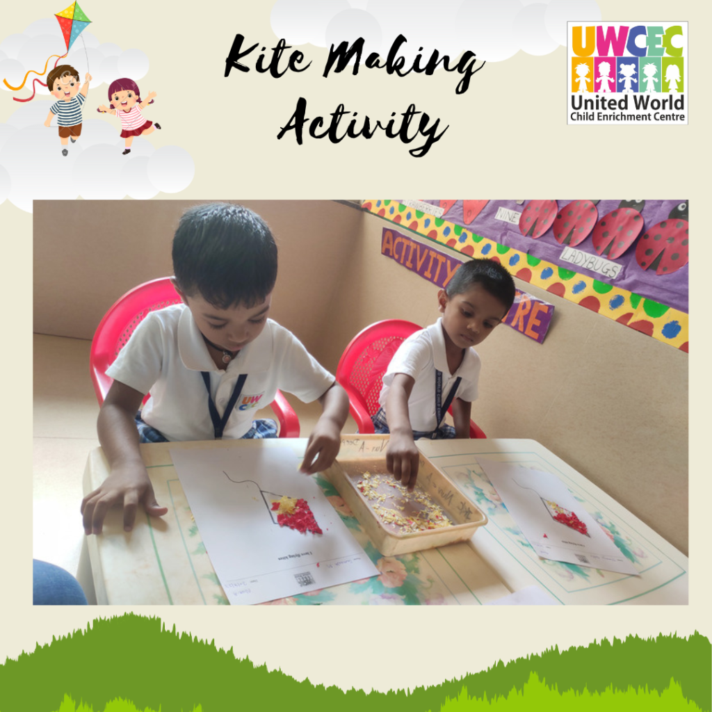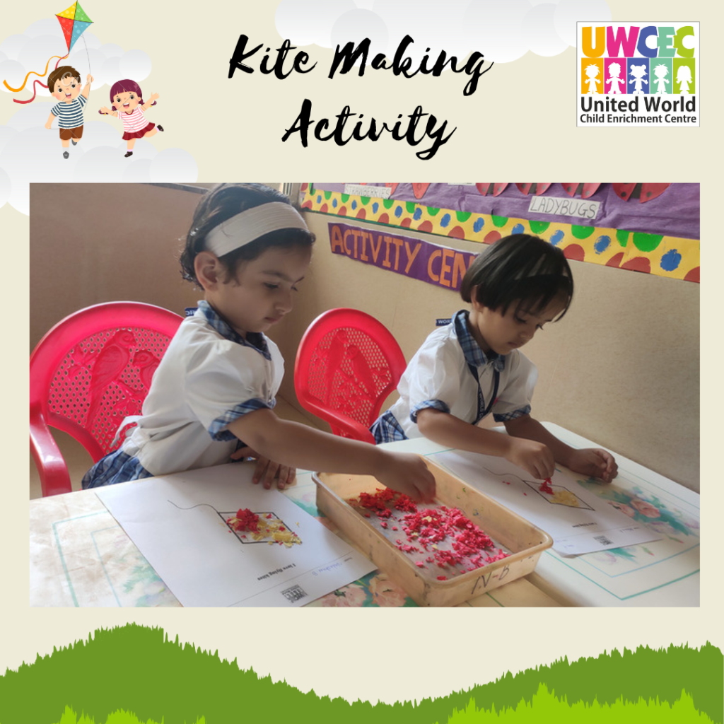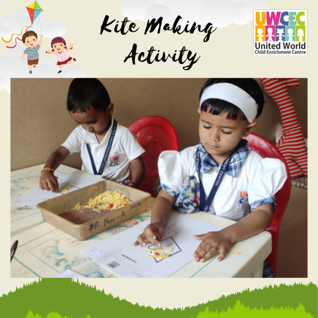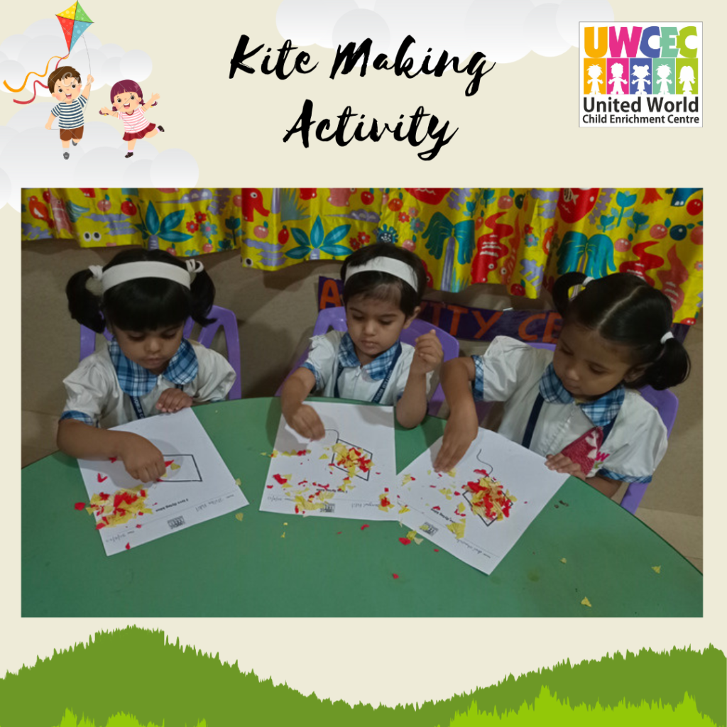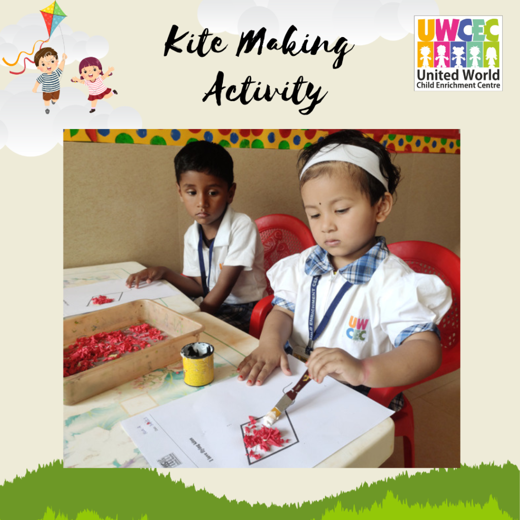 So at UWCEC we taught children how to tear and paste two different colors of crepe paper on their worksheets to form a colorful kite. This helped to enhance their hand-eye co-ordination and also to promote creativity.