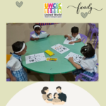 Students were explained the characteristics of each member through puppets, cartoon pictures and a worksheet activity of mom and dad wherein they had to complete the picture by drawing a few lines on it. The teachers had even planned a game in which the cutouts of all the family members were laid on the mat and the students were supposed to choose the correct member’s picture and put it in the respective basket.