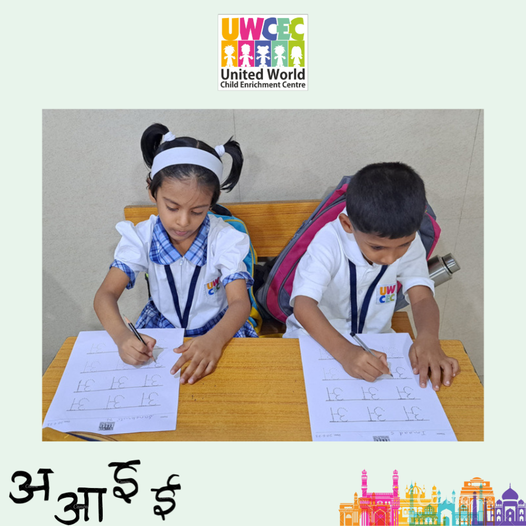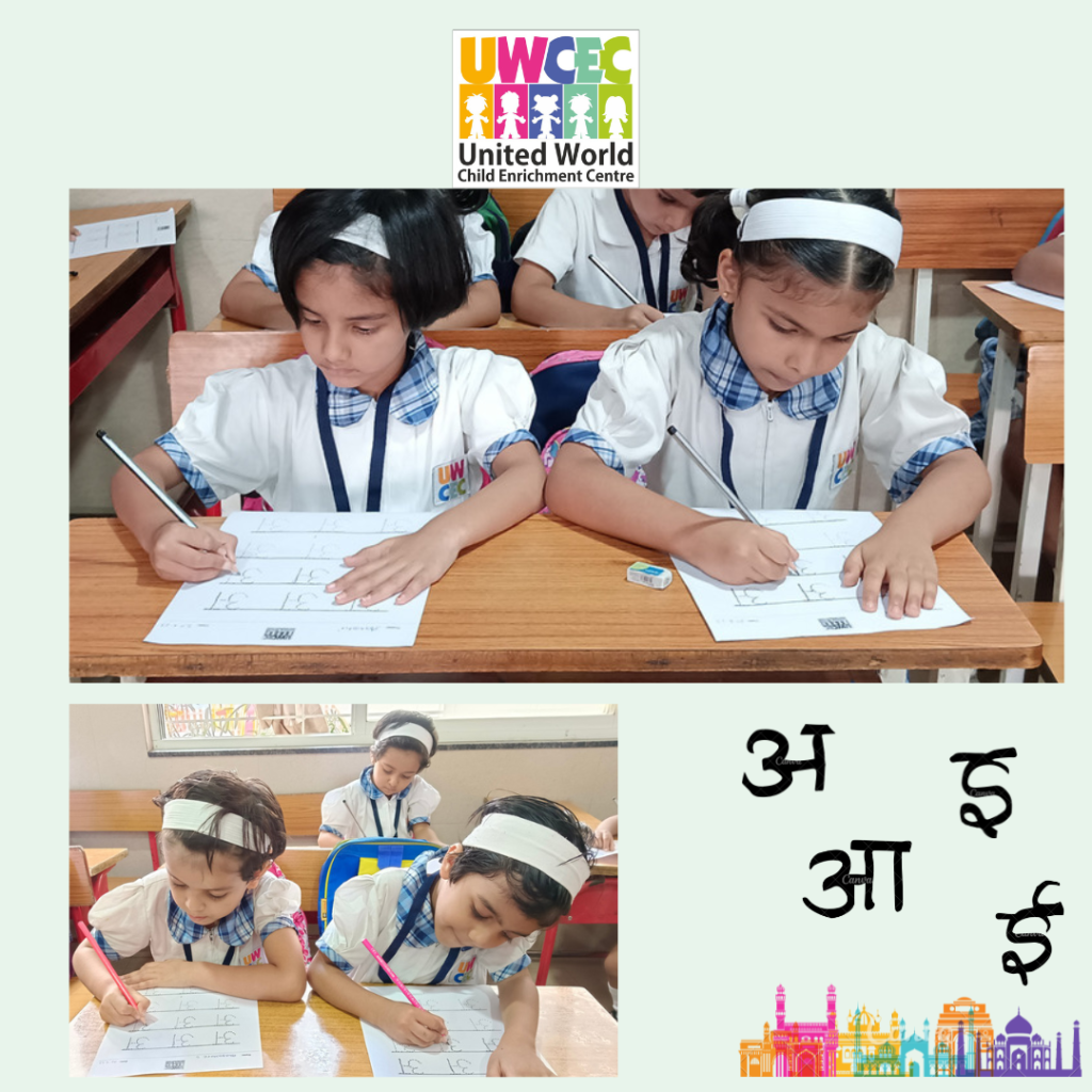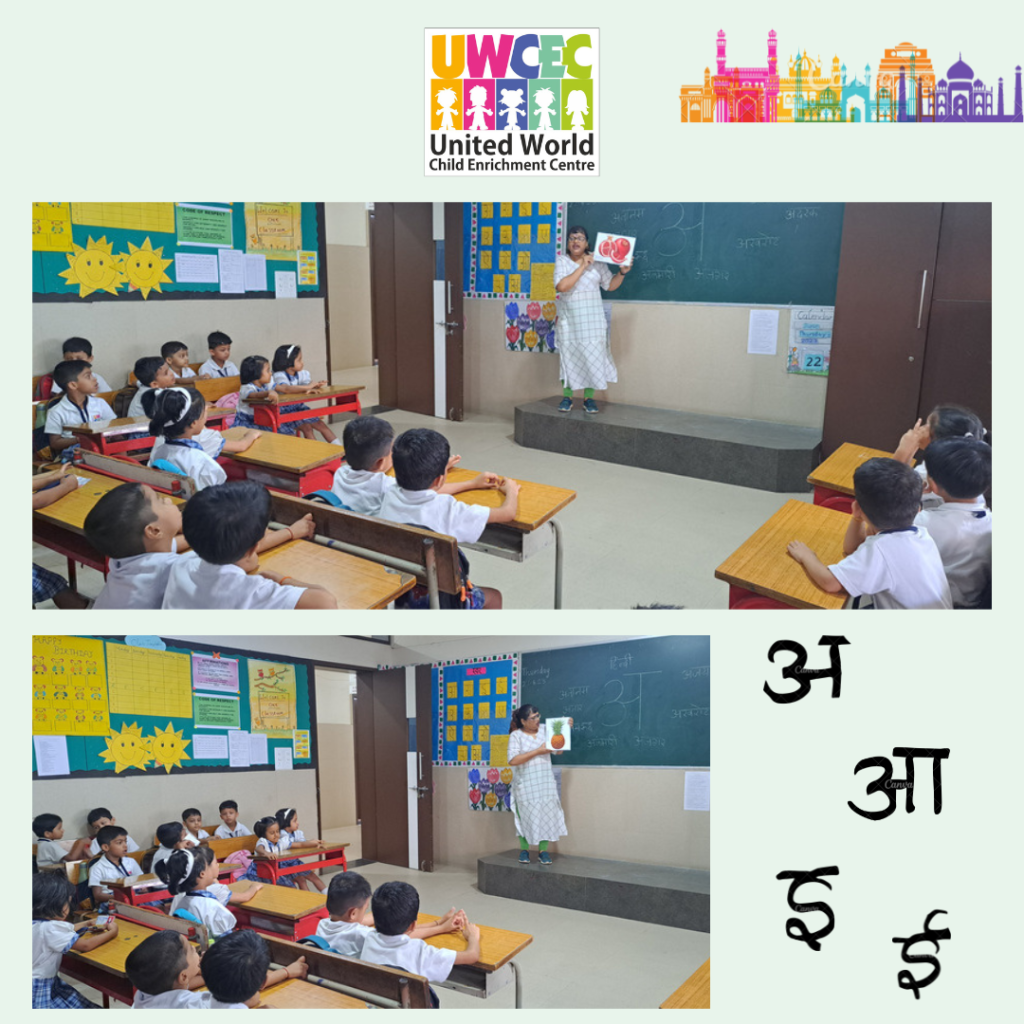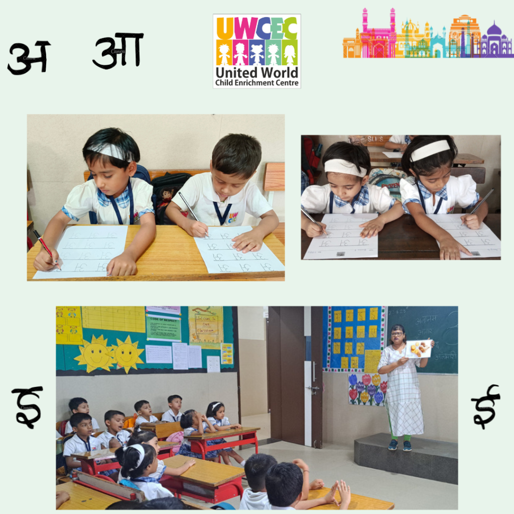 In UWCEC this year we introduced Hindi to the Sr kg students. They are learning the language in interesting ways. Teachers have started teaching the Hindi “swar” through simple words which the students can relate to easily. They are also helping the children revise Hindi with patterns like daya, vakra aadi rekha, khadi rekha.