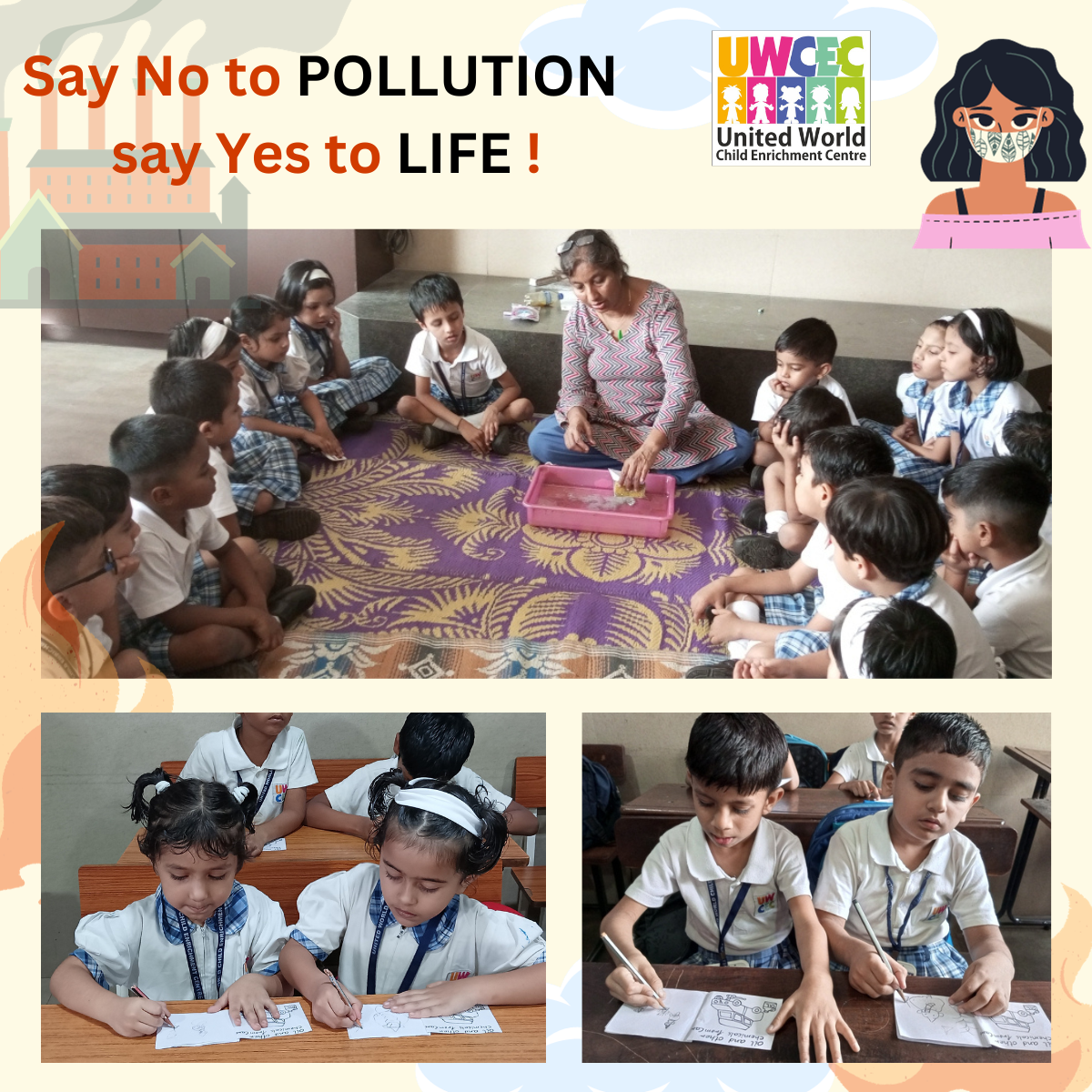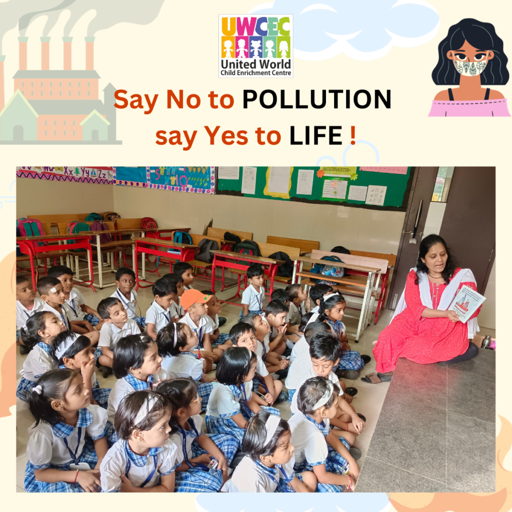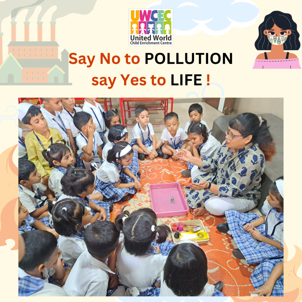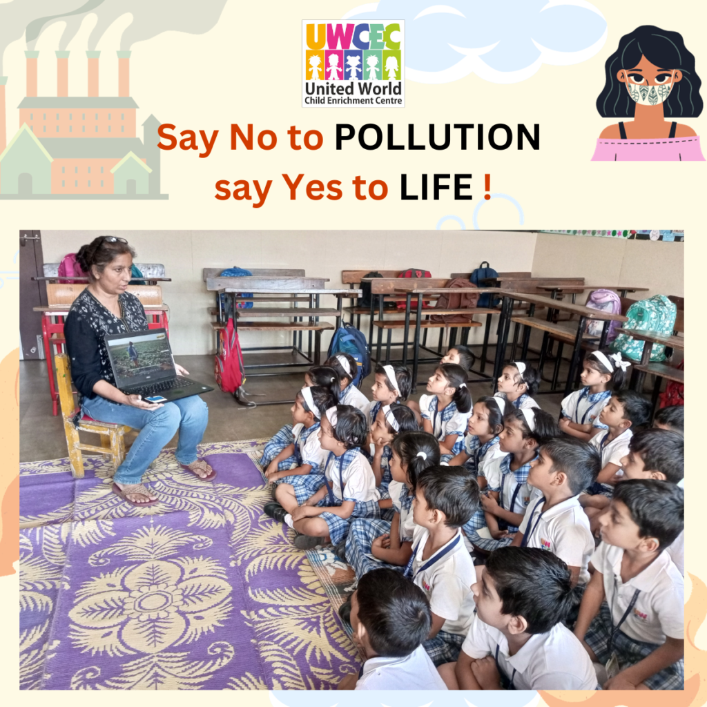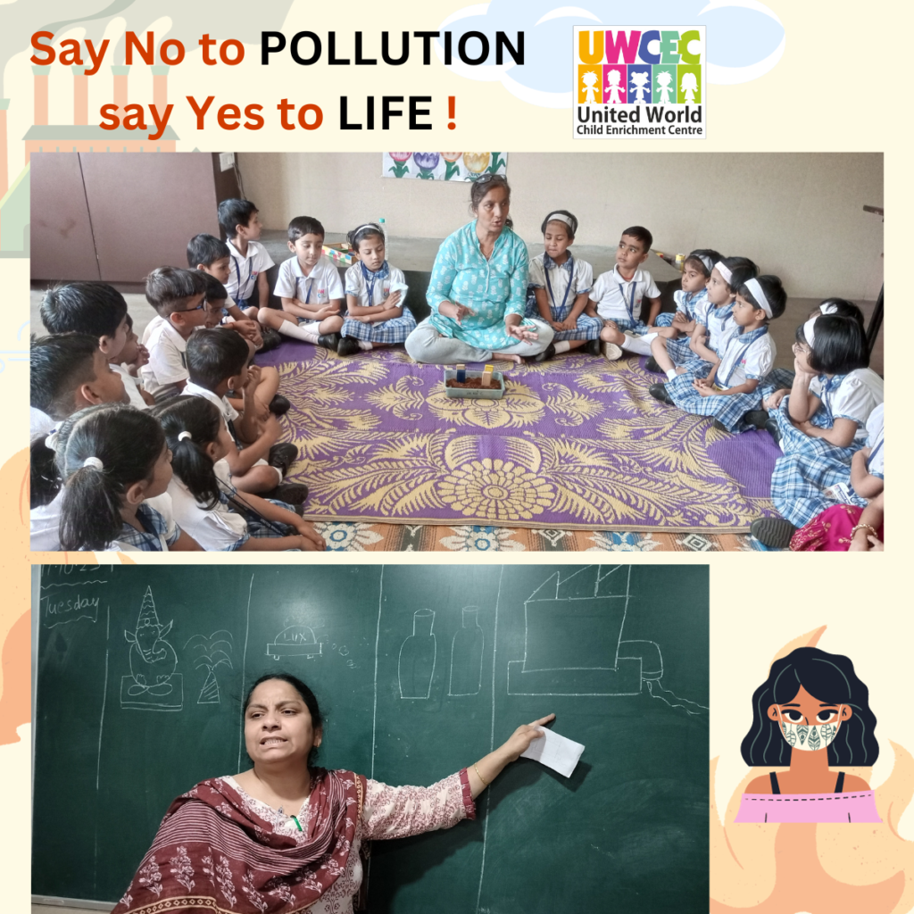 At UWCEC, the teachers taught the Sr.Kg. students about the hazards of water pollution and how human beings and all plants and animals get affected by it. Students were also explained some more causes of water pollution due to oil spills, pesticides, construction work and festivals.