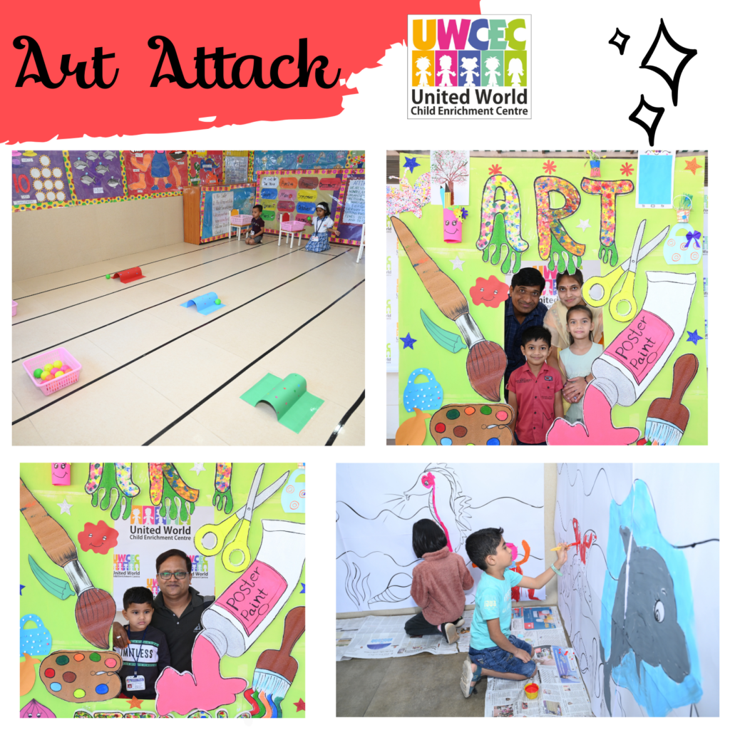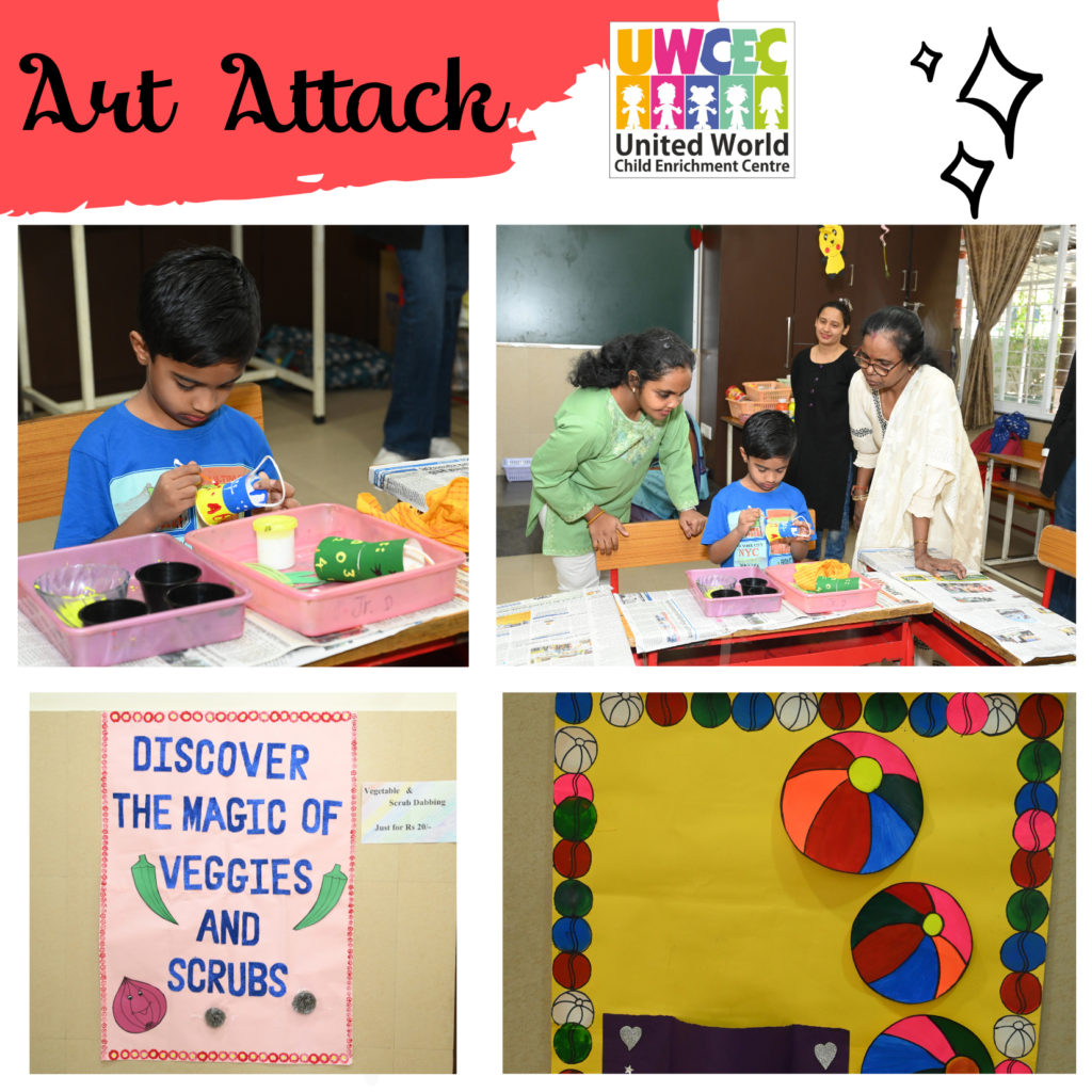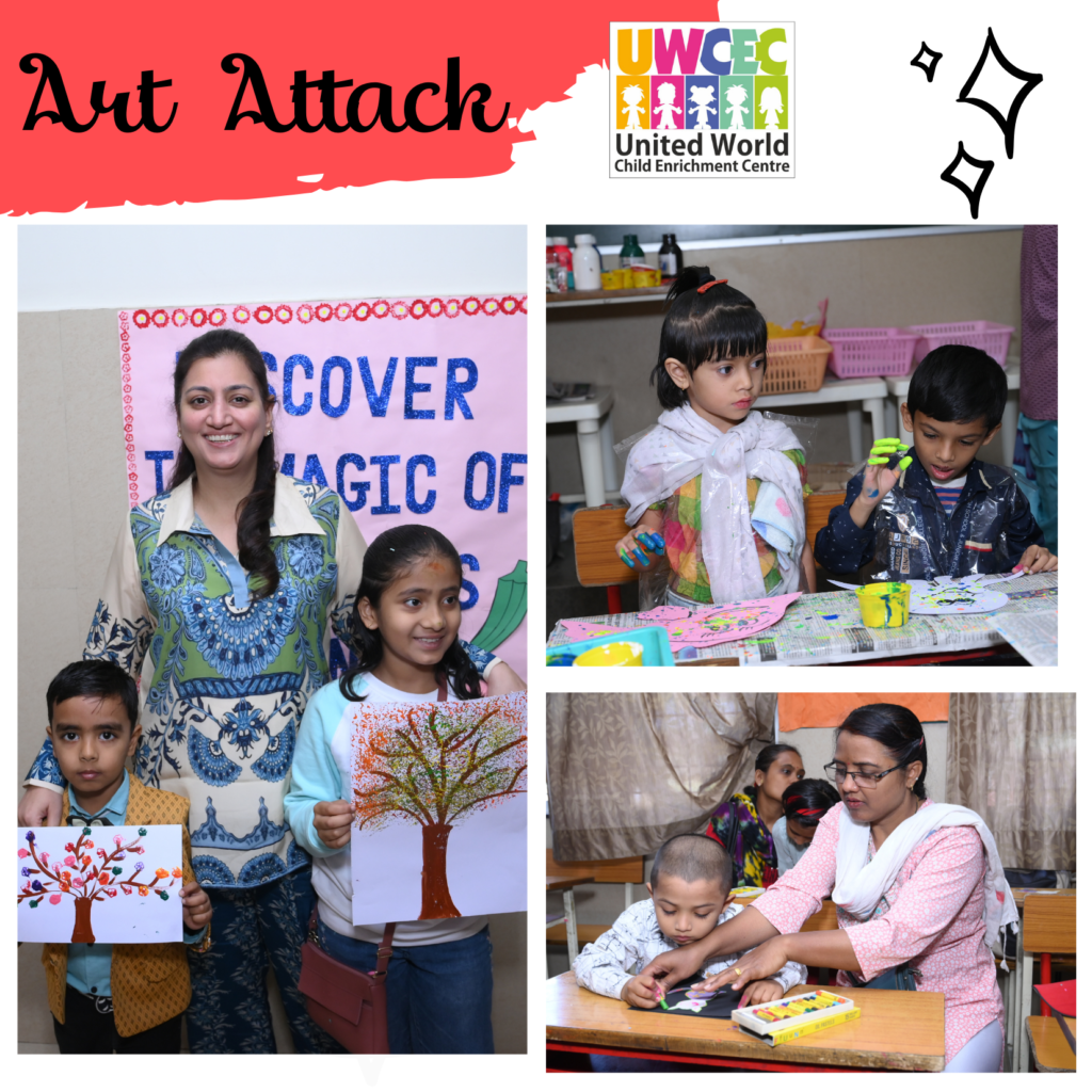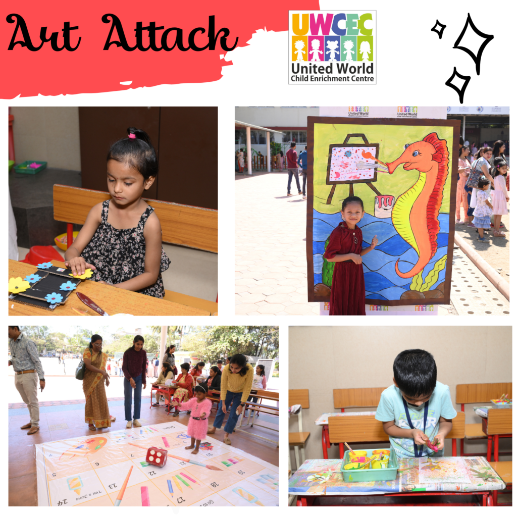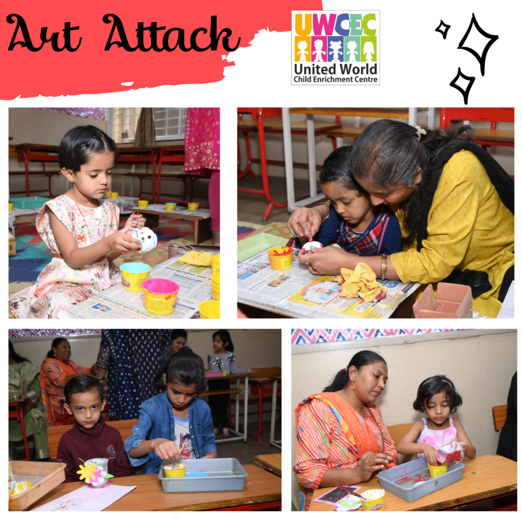 Keeping this in mind UWCEC has always given equal importance to studies as well as art and craft. A special day called ‘Art Attack’ was organized by the UWCEC school. It was an art feast where children from Nursery to grade 3rd were invited . The complete school was decorated with stuffs related to art to welcome the students. The teachers had organised activities like pot and candle painting, Wallet and paper bag making, Vegetable and scrub dabbing, making photo frame and birthday popper and many more fun , easy and interesting activities as well as games were there.